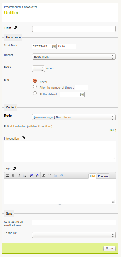You choose the option that suits you best: Creating and Sending manual (first image below) or Automatic (second image) for your newsletter.