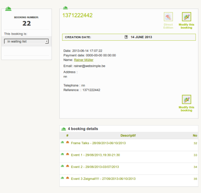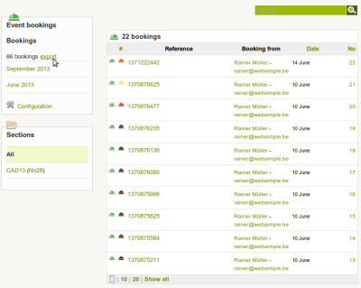 In the back-end the webmaster can view and export the bookings.
