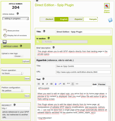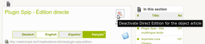 When you want to edit an Spip object, you arrive first at its home page where a preview of its content is displayed, then you must press the edit button to get to the objects editing screen.