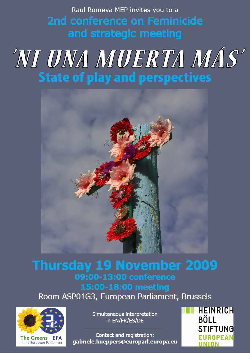 MEP Raül Romeva les invita cordialmente a la segunda Conferencia sobre Feminicidio y seguidamente a una reunión estratégica en el Parlamento Europeo 19 Noviembre 2009 Conferencia: de 9:00 am a 1:00 pm Reunión Estratégica: de 3:00 pm a 6:00 pm Interpretación: ES, EN, DE