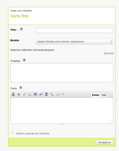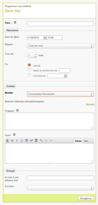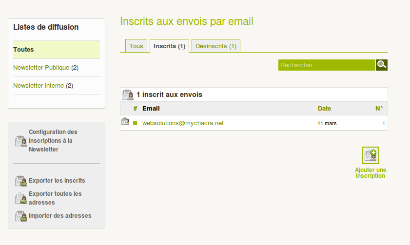 Cette fonctionnalité vous permet de gérer une ou plusieurs lettre(s) d’information (avec import et export de listes d’inscription) à envoyer à vos contacts.